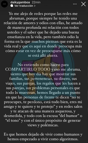 Posteriormente, el joven agradeció a su comunidad de seguidores el cariño y respaldo que le han demostrado a pesar de que ahora se muestra ausente de las redes sociales, pues asegura que no logra entender “cómo hacen las personas para compartirlo todo sobre su vida”.