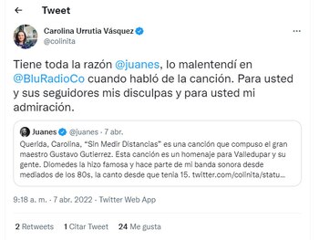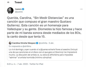 El tema no terminó allí, pues el artista paisa también vio el trino de la funcionaria de la Alcaldía de Bogotá y decidió responderle. Juanes aclaró que su homenaje era para Valledupar y su gente, además, que para él ha sido una canción importante desde su niñez.