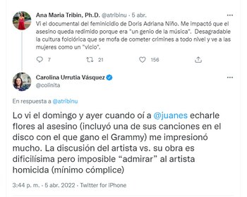 En un trino Carolina Urrutia señaló que vio el reportaje sobre Diomedes y la muerte de Doris Adriana Niño, pero “cuando oí a Juanes echarle flores al asesino (incluyó una de sus canciones en el disco con el que ganó el Grammy) me impresionó mucho. La discusión del artista vs su obra es dificilísima pero imposible ‘admirar’ al artista homicida (mínimo cómplice)”.