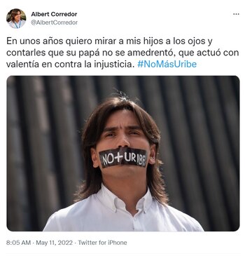 Además, sorprendió a muchos de sus seguidores en redes con una foto en redes donde con una cinta negra en la boca manda el mensaje de “No + Uribe”. Y afirmó en un video: “Uribe trató de silenciar nuestra voz y la voz de las miles de personas a las que representamos desde el Concejo. La justicia nos dio la razón. Ahora el que debe irse es él. No vine a representar a un partido o un expresidente. Estoy aquí para trabajar por Medellín”.