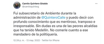 En medio de la polémica, Camilo Quintero Giraldo, exsubsecretario de Medio Ambiente, se refirió al Alcalde de Medellín, a quien llamó, a través de Twitter, “mentiroso, tramposo e irresponsable”.