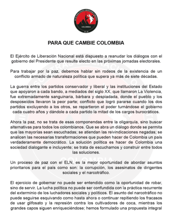 Además, el grupo armado señaló que está dispuesto a entablar nuevas conversaciones con el Gobierno Nacional cuando se conozca al nuevo presidente de la República: “El Ejercito de Liberación Nacional está dispuesto a reanudar diálogos con el gobierno del Presidente que resulte electo en las próximas jornadas electorales”.