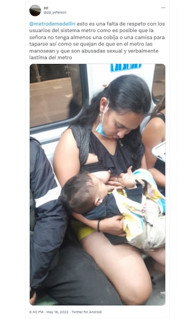 Un caso de intolerancia se presentó este miércoles en el Metro de Medellín, cuando una mujer amamantaba a su hijo en uno de los trenes del servicio público. La imagen quedó registrada en Twitter y estuvo acompañada del siguiente mensaje: “Esto es una falta de respeto con los usuarios del sistema metro, como es posible que la señora no tenga al menos una cobija o una camisa para taparse, así como se quejan de que en el metro las manosean y que son abusadas sexual y verbalmente lástima del metro”, dijo el usuario @pp_yeferson, quien realizó este comentario violento hacia las mujeres alrededor de las 7 de la noche.