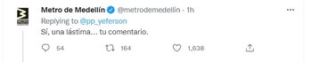 La respuesta de la cuenta oficial del Metro de Medellín no se hizo esperar, “Sí, una lástima... tu comentario”, fueron las palabras con las que se respondió a este comentario misógino, machista y agresivo hacia la mujer que le estaba dando de comer a su hijo. El respaldo de la gente fue inmediato y el trino, en menos de una hora de ser publicado, ya contaba con más de 1.200 ‘me gusta’ y 200 retwittes.