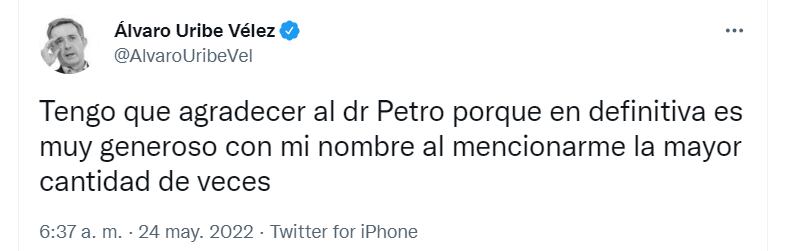 El expresidente reaccionó en la mañana de este martes ante las intervenciones de Petro, quien también tocó el tema de los llamados ‘falsos positivos’. A través de su cuenta de Twitter, el político antioqueño le envió un particular mensaje: