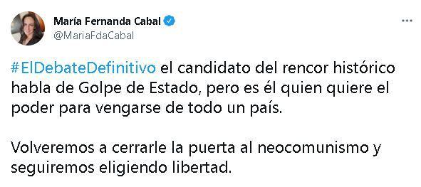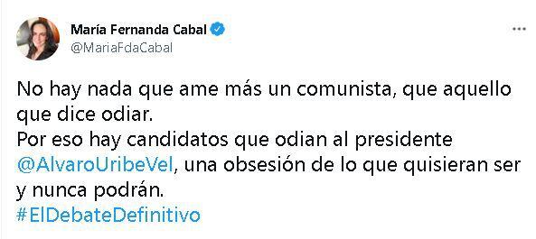 “Colombia quiere presidente y no un tirano convencido de que el poder es una deuda histórica con él, sin haber hecho más méritos que incendiar el país con discursos de odio y mentiras. #ElDebateDefinitivo es hoy, pero lo ratificaremos en las urnas”.