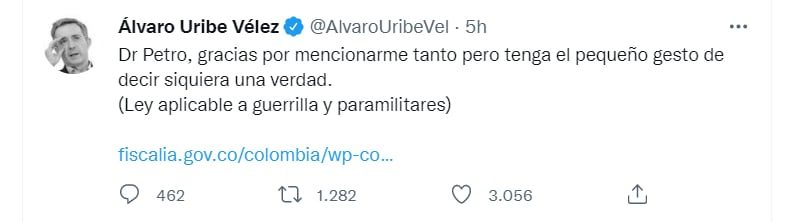 Una hora después de ese primer trino, el exsenador del Centro Democrático remarcó sus muestras de agradecimiento al ser nombrado por Petro en reiteradas ocasiones, pero esta vez lo tildó de ‘mentiroso’: “Dr. Petro, gracias por mencionarme tanto, pero tenga el pequeño gesto de decir siquiera una verdad. (Ley aplicable a guerrilla y paramilitares)”. Y seguido de esto, adjuntó un link que remite a un documento de la Fiscalía General de la Nación en el que se explica la Ley de Justicia y Paz.