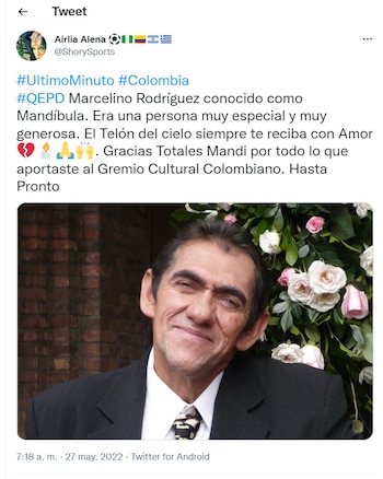 Marcelino Rodríguez era bogotano, tenía 71 años, y desde hace nueve venía enfrentando el alzhéimer, enfermedad que poco a poco fue debilitando la vida del comediante y hasta lo hizo olvidar de gran parte de lo que pasó durante sus 30 años presentándose en el programa de comedia. Sin embargo, fue el covid-19 el que terminó por quitarle la vida a Mandíbula.