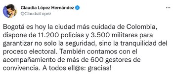 La mandataria publicó un trino en el que destaca la seguridad con la que contará la capital colombiana en medio de los comicios electorales En una intervención afirmó que, “Bogotá es hoy la ciudad más cuidada de Colombia, dispone de 11.200 policías y 3.500 militares para garantizar no solo la seguridad, sino la tranquilidad del proceso electoral. También contamos con el acompañamiento de más de 600 gestores de convivencia. A todos ell@s: gracias!”.