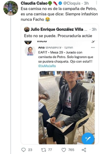 Otro de los momentos que se volvió protagonista en redes sociales, fue el llamado que hicieron seguidores de Federico Gutiérrez por cuenta de una jurado de votación, quien asistió con una camiseta que decía ‘siempre fashion, nunca facho’, lo cual los hizo sentir molestos porque consideran que fue un claro ataque hacia su candidato y apoyo hacia Gustavo Petro, aun cuando en el mensaje no se nombra a ninguno de los dos políticos.