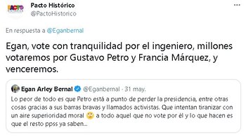 “Egan (Bernal) vote con tranquilidad por el ingeniero, millones votaremos por Gustavo Petro y Francia Márquez, y venceremos”, afirmó la cuenta de Twitter del Pacto Histórico en sus redes sociales. El ciclista, aunque no respondió directamente a este mensaje, sí dejó otro mensaje en sus redes sociales e incluso envió un mensaje de cariño.