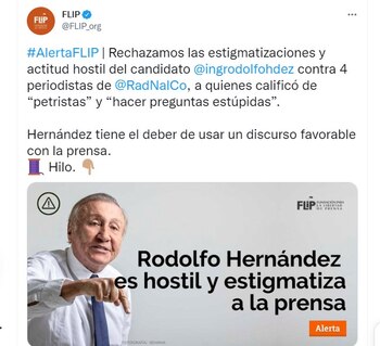 Las particulares respuestas de quien quedó en segundo lugar en las pasadas elecciones y alcanzó casi 6 millones de votos, fueron duramente cuestionadas por la FLIP, que calificó de “estigmatizantes y hostiles” las declaraciones de Rodolfo Hernández y lo exhortaron a que realice “un discurso favorable con la prensa”.