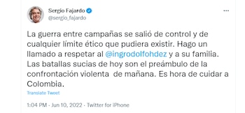 “La guerra entre campañas se salió de control y de cualquier límite ético que pudiera existir. Hago un llamado a respetar al @ingrodolfohdez y a su familia. Las batallas sucias de hoy son el preámbulo de la confrontación violenta de mañana. Es hora de cuidar a Colombia”.