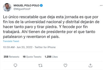 “Lo único rescatable que deja esta jornada es que por fin los de la universidad nacional y distrital dejarán de hacer tanto paro y tirar piedra. Y Fecode por fin trabajará. Ahí tienen de presidente por el que tanto patalearon y reventaron el país”.
