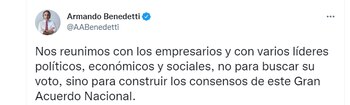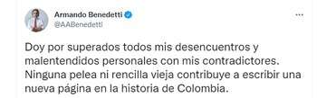 Tras la victoria de Gustavo Petro en las elecciones del pasado 19 de junio en donde sumó más de 11 millones de votos, el senador Armando Benedetti celebró la victoria en las urnas y en su cuenta de Twitter aseguró que, “doy por superados todos mis desencuentros y malentendidos personales con mis contradictores. Ninguna pelea ni rencilla vieja contribuye a escribir una nueva página en la historia de Colombia”.
