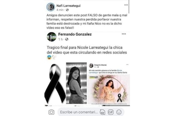 “Amigos denuncien este post FALSO de gente mala que mal informan. Respeten nuestra pérdida por favor, nuestra familia está destrozada y mi ñaña Nico no es la de dicho video, eso es falso”, escribió en su perfil de Facebook, Nafi Lateaguerri.