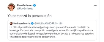 “Le pido al presidente electo Gustavo Petro que considere en la comisión de investigación contra la corrupción investigar la actuación de Enrique Peñalosa como alcalde de Bogotá y su gobierno por haber botado a la basura los estudios finalizados del proyecto Metro subterráneo”, señaló Morris en su cuenta oficial de Twitter.