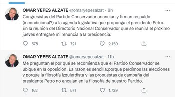 La renuncia de Omar Yepes a la presidencia del Partido Conservador se daría tras el apoyo de la bancada en el Congreso de la República al gobierno entrante del presidente electo, Gustavo Petro Urrego.