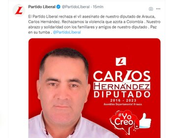 “El Partido Liberal rechaza el vil asesinato de nuestro diputado de Arauca, Carlos Hernández. Rechazamos la violencia que azota a Colombia. Nuestro abrazo y solidaridad con los familiares y amigos de nuestro diputado. Paz en su tumba”, señalaron en sus redes sociales y añadieron una imagen del político.
