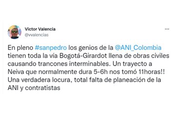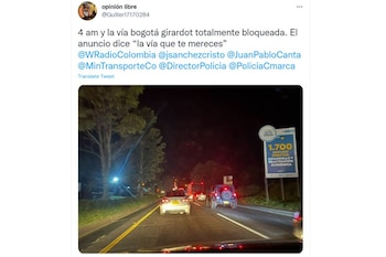 “Es increíble que hoy saliste Bogotá por la calle 80 rumbo a Girardot y 7 horas por los trancones en Funza y la gran vía, lo peor y descarado ni un solo agente de carreteras que vergüenza”, escribió un usuario de Twitter.
