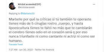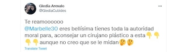 Por ejemplo una usuaria tuiteó: “Te reamoooooo @Marbelle30 eres bellísima tienes toda la autoridad moral para, aconsejar un cirujano plástico a esta👇👇👇👇aunque no creo que se le midan”.