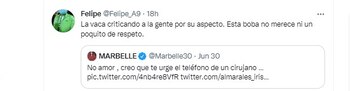 Otro usuario le escribió: “Claro amor, no ves lo linda que es Marbelle, toda una diva :v” adjuntando una foto en la que se ve a la cantante cuando tenía sobrepeso –que para no caer en el mismo juego de la cantante, Infobae Colombia omite su publicación–.