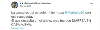 Otro usuario también apoyó a la cantante escribiendo: “La sacastes del estadio mi hermosa @Marbelle30 con esa respuesta. Si que necesita un cirujano, mas fea que DIARREA EN CASA AJENA”.