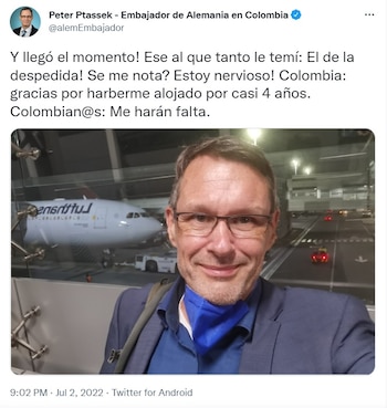 El 2 de julio, en las horas de la noche, el embajador de Alemania, Peter Ptassek, tomó un avión hacia Berlín tras terminar su periodo en tierra colombiana como representante de su nación. El diplomático dejó un corto pero sentido mensaje en sus redes sociales donde aseguró que extrañará el país y sus ciudadanos.