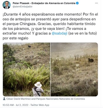 “¡Durante 4 años esperábamos este momento! Por fin el oso de anteojos se presentó ayer para despedirnos en el parque Chingaza. Gracias, querido habitante tímido de los páramos, ¡y que te vaya bien! ¡Te vamos a extrañar mucho! Y gracias a @sabdaji (se ve en la foto) por este regalo”, escribió Peter Ptassek.