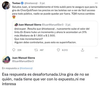 “Saludos Juan, si lamentablemente el tinto subió pero te aseguro que para la gira de ChocQuibTown los precios en las boletas van a ser de fácil acceso para todo público, nadie se puede quedar por fuera. TQM nunca cambies”, escribió en respuesta en su cuenta de Twitter.
