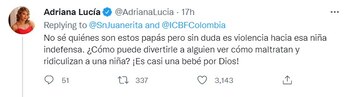Inclusive hasta a mismos famosos llegó a indignar el hecho denunciado en el trino, la cantautora Adriana Lucía indicó: “No sé quiénes son estos papás pero sin duda es violencia hacia esa niña indefensa. ¿Cómo puede divertirle a alguien ver cómo maltratan y ridiculizan a una niña? ¡Es casi una bebé por Dios!”.