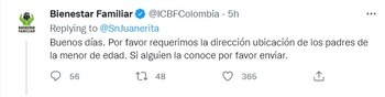 Pues el trino no pasó desapercibido, no solo por la masiva respuesta que tuvo por parte de los usuarios sino también del Instituto de Bienestar Familiar que lo respondió solicitando la dirección de los acudientes de la menor presuntamente para iniciar con la investigación pertinente.