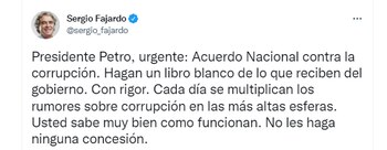 Y en otro trino le solicitó al mandatario electo la creación de este acuerdo: “Presidente Petro, urgente: Acuerdo Nacional contra la corrupción. Hagan un libro blanco de lo que reciben del gobierno. Con rigor. Cada día se multiplican los rumores sobre corrupción en las más altas esferas. Usted sabe muy bien como funcionan. No les haga ninguna concesión”.