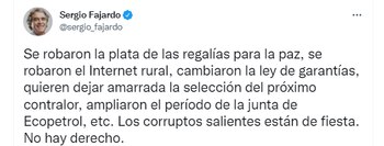 “Se robaron la plata de las regalías para la paz, se robaron el Internet rural, cambiaron la ley de garantías, quieren dejar amarrada la selección del próximo contralor, ampliaron el período de la junta de Ecopetrol, etc. Los corruptos salientes están de fiesta. No hay derecho”, aseveró el excandidato presidencial en su cuenta de Twitter, en donde mencionó nuevamente la solicitud del Acuerdo Nacional Contra la Corrupción.