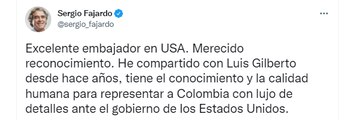 Además recientemente resaltó la decisión de Gustavo Petro de nombrar a Luis Gilberto Murillo, exfórmula vicepresidencial de Fajardo, como nuevo embajador de Colombia en los Estados Unidos. Sobre esto, el exalcalde de Medellín señaló que, “Excelente embajador en USA. Merecido reconocimiento. He compartido con Luis Gilberto desde hace años, tiene el conocimiento y la calidad humana para representar a Colombia con lujo de detalles ante el gobierno de los Estados Unidos”.