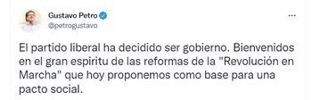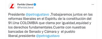 “Presidente Gustavo Petro, trabajaremos juntos en las reformas liberales en el Espíritu de la constitución del 91. Una COLOMBIA que clama por igualdad, equidad y los derechos fundamentales. Cuente con nuestras bancadas de Senado y Cámara y el pueblo liberal, presidente”, señaló el partido político en su cuenta de twitter.