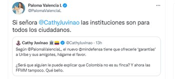 Cathy Juvinao agregó en otro mensaje que, “según Paloma Valencia, el nuevo ministro de Defensa tiene que ofrecerle ‘garantías’ a Uribe y sus amigotes, hágame el favor. ¿Será que alguien le puede explicar que Colombia no es su finca? Y ahora las FFMM tampoco. Qué bello”. Sobre esto, Paloma Valencia respondió, “Si señora, las instituciones son para todos los ciudadanos”.