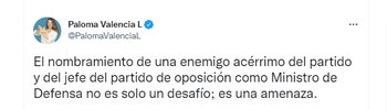 Sin embargo los cuestionamientos por parte de la congresista del Centro Democrático no terminaron ahí, pues en otro trino fue mucho más contundente con respecto a la llegada de Velásquez al Ministerio de Defensa y aseguró que, “el nombramiento de una enemigo acérrimo del partido y del jefe del partido de oposición como Ministro de Defensa no es solo un desafío; es una amenaza”.