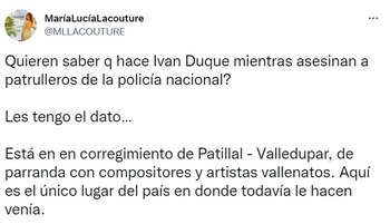 “Quieren saber q hace Iván Duque mientras asesinan a patrulleros de la policía nacional? Les tengo el dato… Está en en corregimiento de Patillal - Valledupar, de parranda con compositores y artistas vallenatos. Aquí es el único lugar del país en donde todavía le hacen venía”, escribió una mujer que aparece en redes con el usuario de MaríaLucíaLacouture.