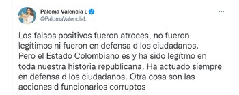 Paloma Valencia, quien ha cuestionado y criticado varios de los nombramientos realizados por el presidente electo en su gabinete, aclaró que, “los falsos positivos fueron atroces, no fueron legítimos ni fueron en defensa de los ciudadanos. Pero el Estado Colombiano es y ha sido legítimo en toda nuestra historia republicana. Ha actuado siempre en defensa d los ciudadanos. Otra cosa son las acciones de funcionarios corruptos”.