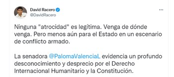 Sobre esta publicación, el presidente de la cámara de Representantes, David Racero, respondió a la senadora del Centro Democrático y resaltó que, “Ninguna “atrocidad” es legítima. Venga de dónde venga. Pero menos aún para el Estado en un escenario de conflicto armado. La senadora Paloma Valencia evidencia un profundo desconocimiento y desprecio por el Derecho Internacional Humanitario y la Constitución”.