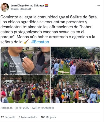 “Comienza a llegar la comunidad gay al Salitre de Bgta. Los chicos agredidos se encuentran presentes y desmienten totalmente las afirmaciones de “haber estado protagonizando escenas sexuales en el parque”. Menos aún haber arrastrado o agredido a la señora de la . #Besaton”, reportó un internauta por Twitter.