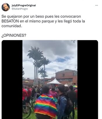Otro usuario en redes anotó: “Hace dos días, una pareja de chicos en Salitre, Bogotá, fue insultada y golpeada con palos por unas señoras por besarse en un parque. Hoy, a las 11 de la mañana, se han reunido cientos de personas en el mismo sitio para un Besaton. TE AMO COLOMBIA”.
