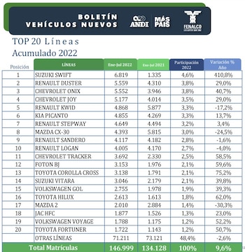 En lo corrido del año siguen liderando Renault con 27.516 y Chevrolet con 23.599 unidades vendidas en el acumulado total. Sin embargo, en el tercer lugar se ubica Toyota con 14.055, con lo que desplaza a Suzuki al cuarto lugar para 12.163 carros comercializados a la fecha. En listado lo continúan, en orden, Kia, Volkswagen, Mazda y Nissan.