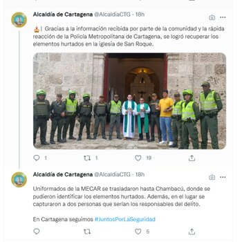 Por su parte, la Policía de Cartagena informó en su comunicado que “gracias a la información recibida por parte de la comunidad y la rápida reacción de la Policía del cuadrante, se pudo determinar el lugar donde posiblemente estarían estos elementos que fueron hurtados a la iglesia en la madrugada de hoy”.