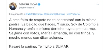 El representante a la Cámara por el Pacto Histórico, Agmeth Escaf, respondió a esta mención por parte de su homóloga y señaló que, “a esta falta de respeto no te contestaré con la misma piedra. Es bajo lo que haces. Y sucio. Soy de Colombia Humana y tenía el mismo derecho tuyo a postularme. Se gana con votos, María Fernanda, no con trinos, y mucho menos con difamaciones. Pasaré la página. Te invito a SUMAR.”.
