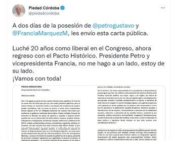 En el documento que dio a conocer en su cuenta de Twitter, la excandidata presidencial reafirmó su apoyo al nuevo Gobierno a pesar de su distancia con el nuevo mandatario. “Luché 20 años como liberal en el Congreso, ahora regreso con el Pacto Histórico. Presidente Petro y vicepresidenta Francia, no me hago a un lado, estoy de su lado” y cerró con una frase que ha utilizado desde que se posesionó como senadora, “¡Vamos con toda!”.