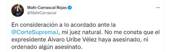 Sobre esto, la senadora María Fernanda Cabal, no solo celebró la decisión de aclarar y rectificar lo mencionado sobre el expresidente Álvaro Uribe Vélez, sino que aprovechó para criticar a Carrascal. En un mensaje en su cuenta de Twitter señaló, “Cabalgando sobre la calumnia como estrategia para hacer política”, luego en otro trino afirmó, “Lástima tan joven y tan depredadora de la honra de los demás”.