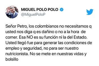 Como el proyecto presentado por el Gobierno pretende gravar algunos alimentos, con la finalidad de prevenir problemas de salud pública como: la hipertensión, obesidad, diabetes y algunos tipos de cáncer, Miguel Polo Polo se fue contra el presidente por ‘meterse’ con la alimentación de los colombianos, como si fuera un ‘nutricionista’.