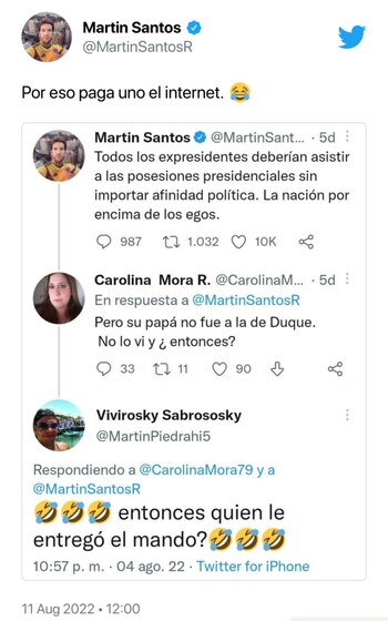 Así se lo hizo saber otro tuitero a la mujer, recalcándole que, en ese entonces -7 de agosto de 2018-, Santos era el presidente saliente, es decir, el que tenía que entregar el cargo al ganador de las elecciones presidenciales de ese año. “¿Entonces quién le entregó el mando?”, cuestionó el hombre añadiendo varios emoticones de risa.